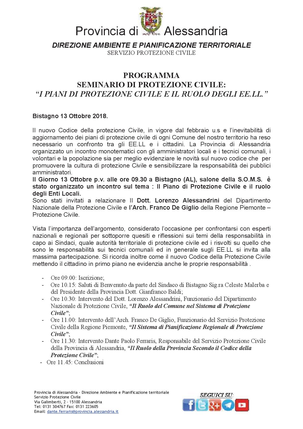 Programma seminario di Protezione Civile Bistagno 13 ottobre 2018