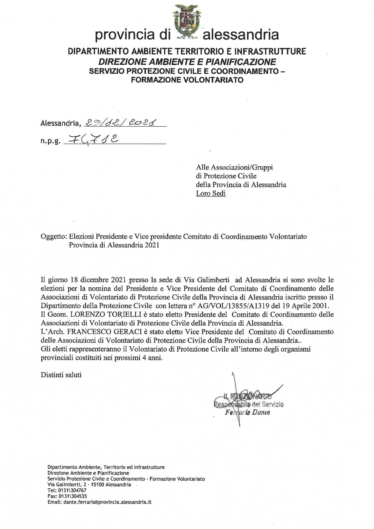 COMUNICAZIONE RISULTATO ELEZIONI PRESIDENTE E VICE PRESIDENTE DEL COMITATO DI COORDINAMENTO DELLE ASSOCIAZIONI DI VOLONTARIATO DI PROTEZIONE CIVILE ED AMBIENTALE DELLA PROVINCIA DI ALESSANDRIA_18.12.2021